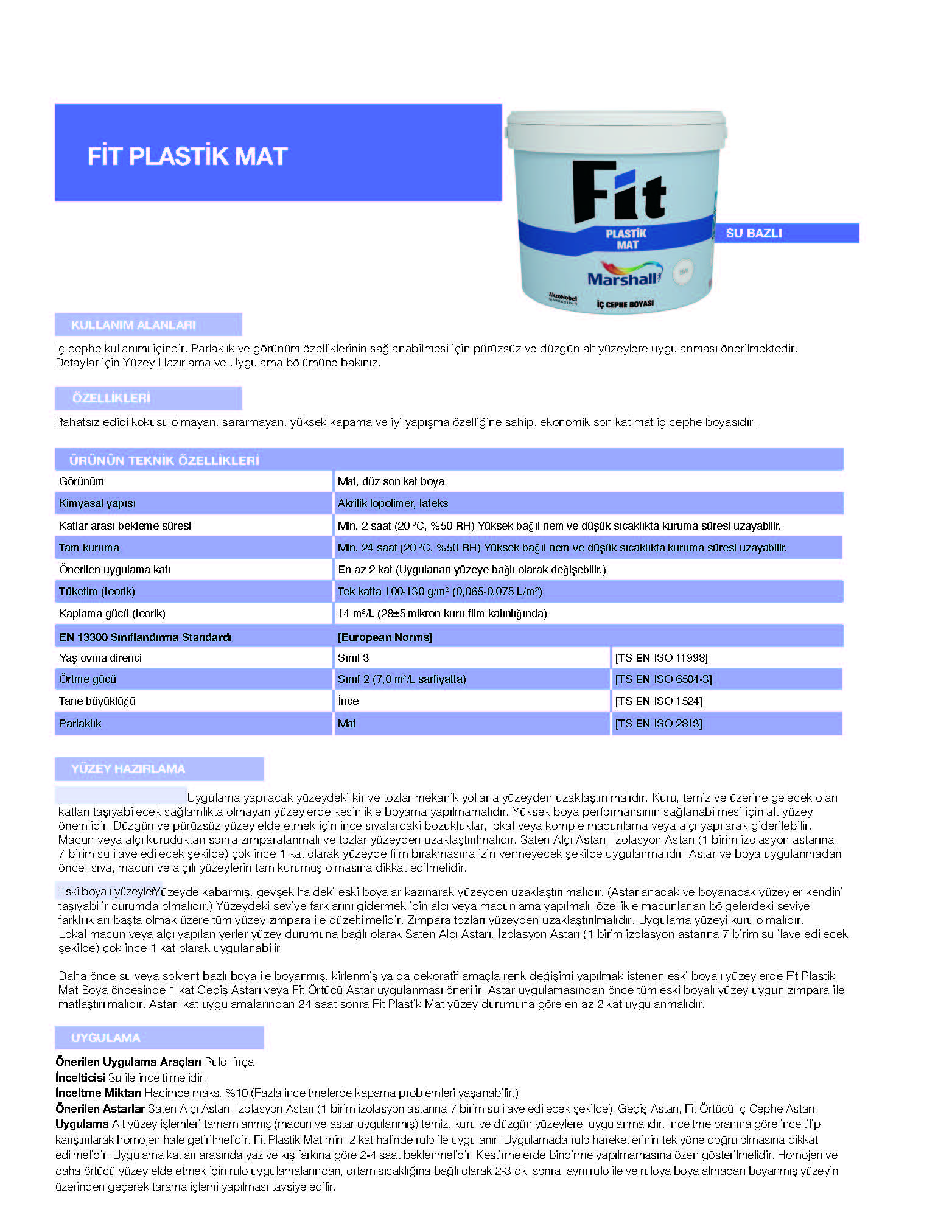Mat Boya öncesinde 1 kat Geçiş Astarı veya Fit Örtücü Astar uygulanması önerilir. Astar uygulamasından önce tüm eski boyalı yüzey uygun zımpara ile
